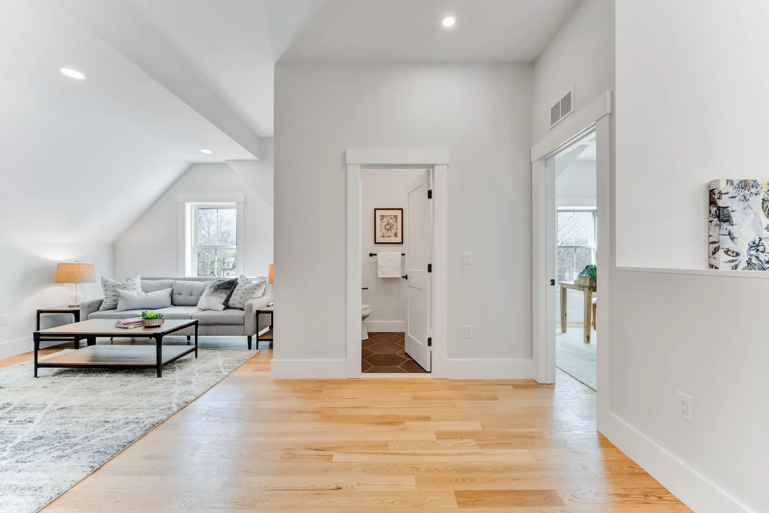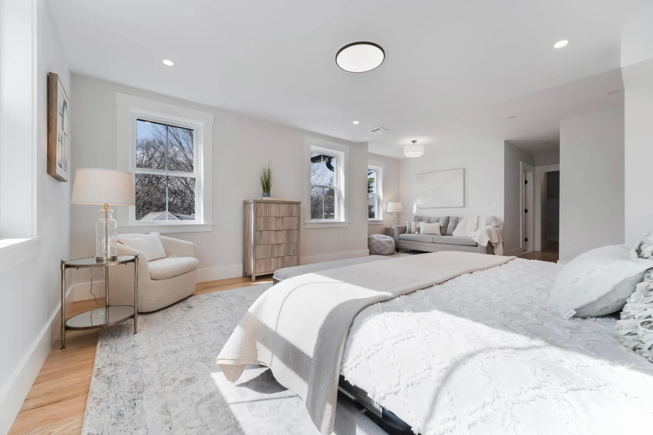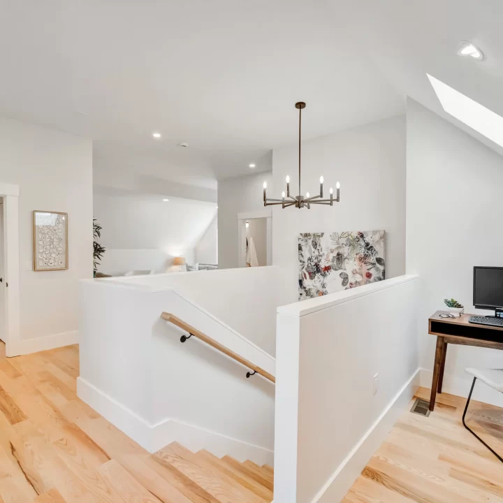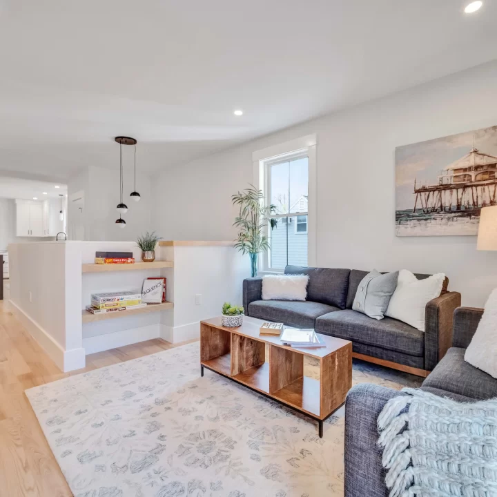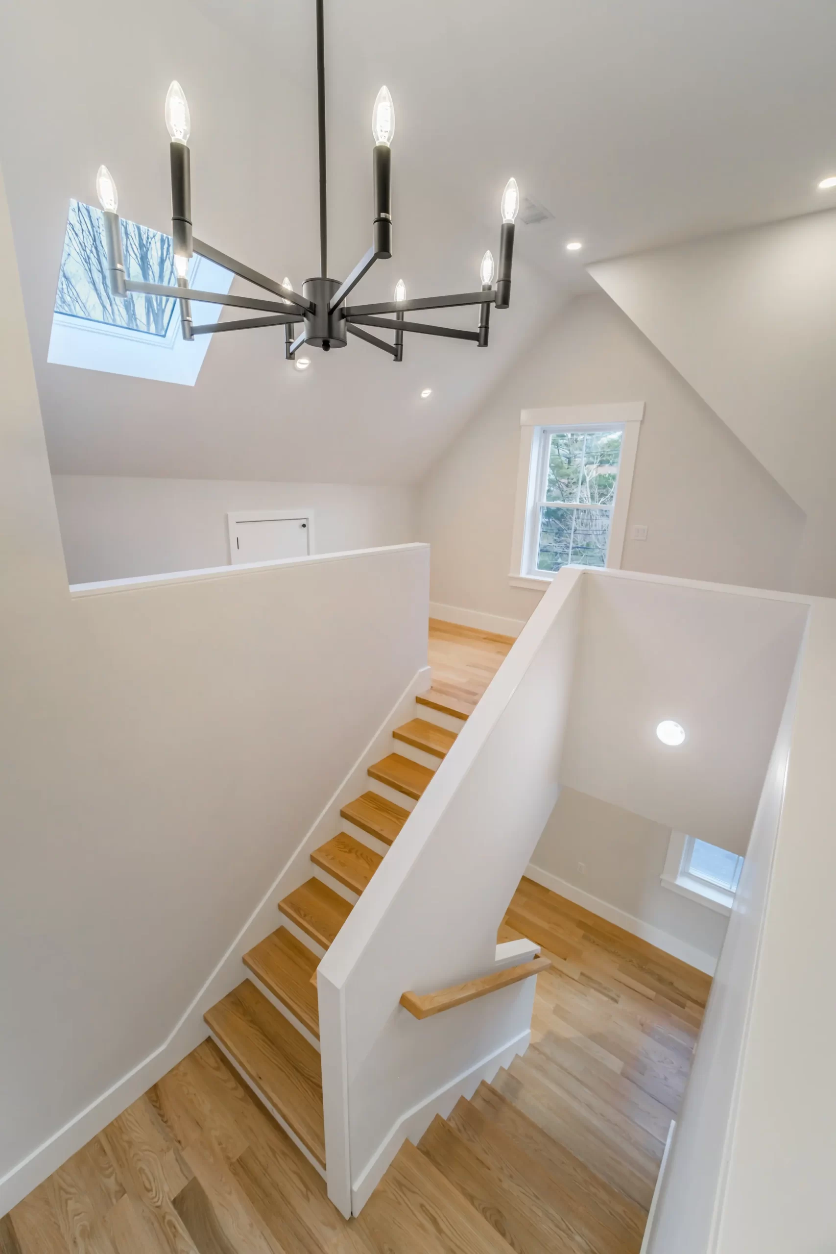 Bathed in light from top to bottom, this striking new home construction is a masterclass in vertical illumination and thoughtful design. Natural light cascades through the stairwell, flowing down from skylights and sizable windows to brighten each level with a warm, airy glow. The first floor offers a distinctly social layout, where an open-concept living and dining area invites effortless entertaining. Just beyond, a cozy, modern kitchen anchors a more intimate space—complete with a family room, bedroom, and full bath—creating a seamless blend of public and private living. This home contains six bedrooms and four full bathrooms, built into a spacious and cohesive layout, each bedroom offers effortless comfort and privacy. Sliding doors offer easy access to the backyard, extending the home’s livability outdoors. At night, a sculptural chandelier suspended in the stairwell casts a soft, ambient light, transforming the vertical core of the home into a glowing architectural centerpiece.