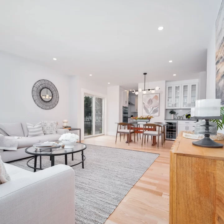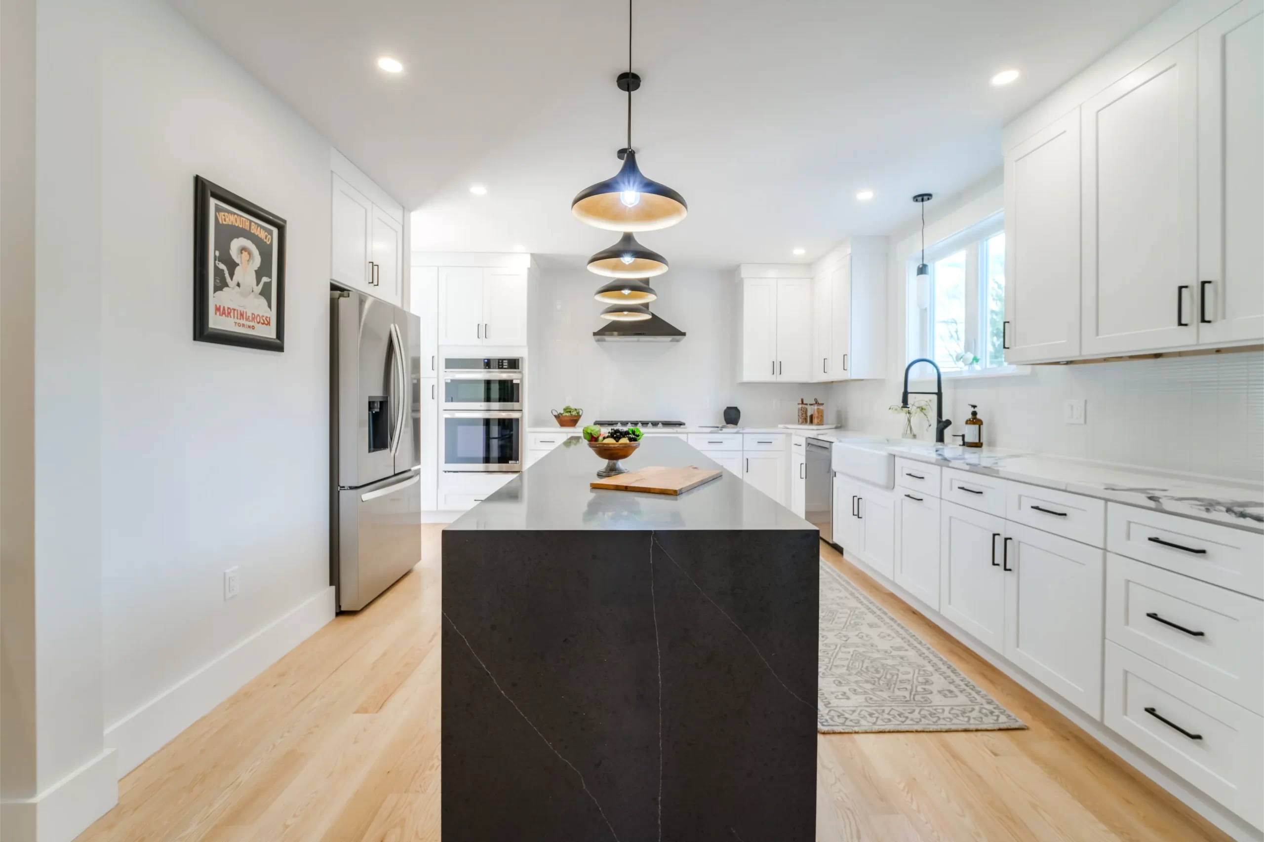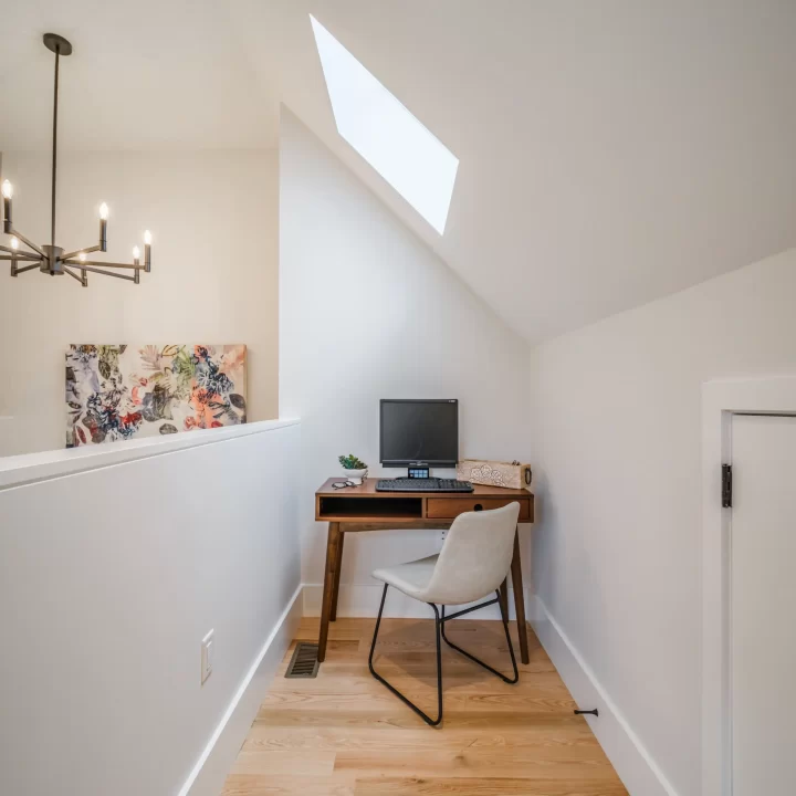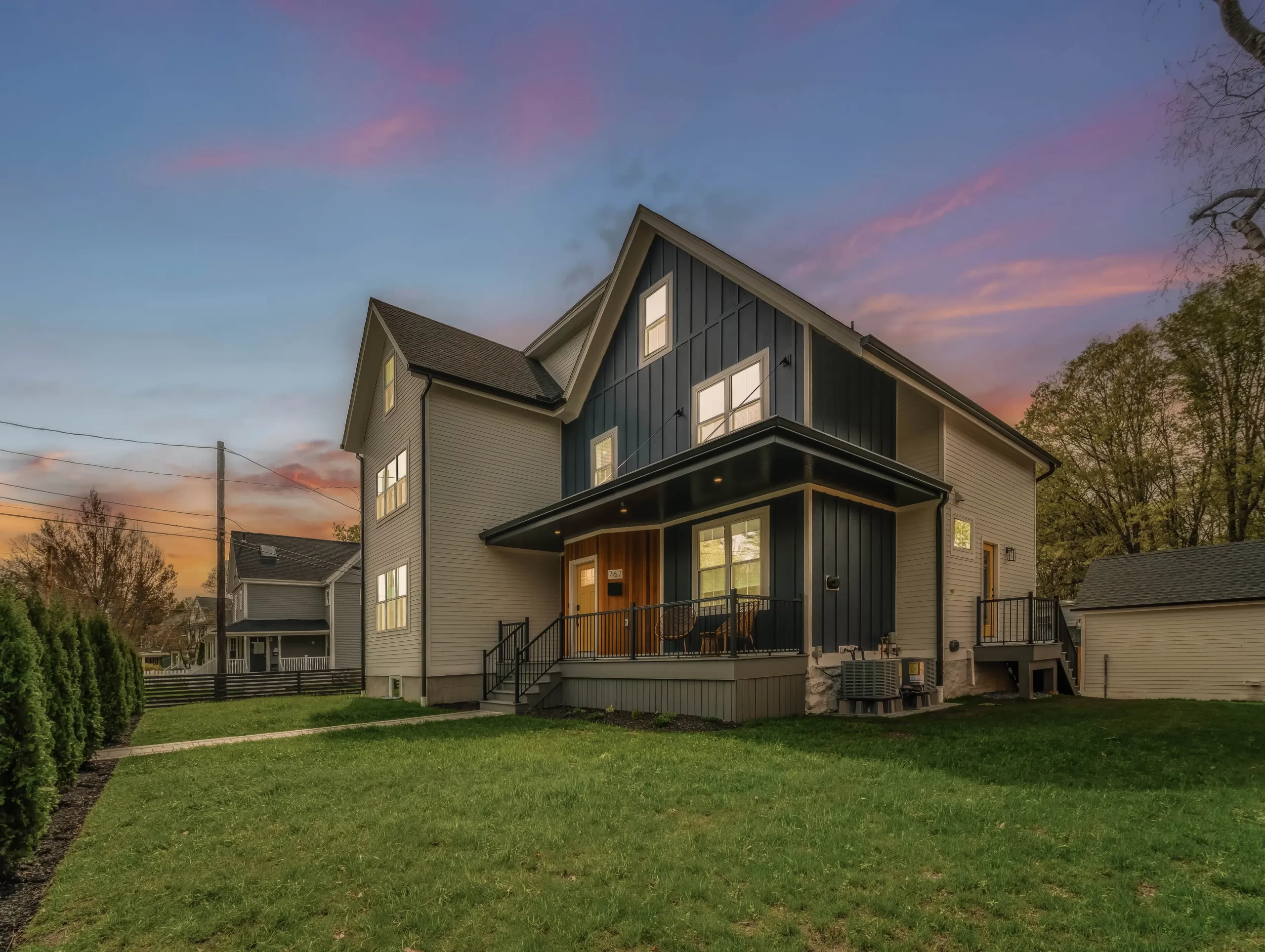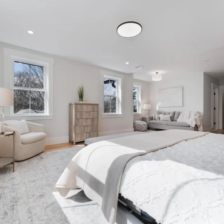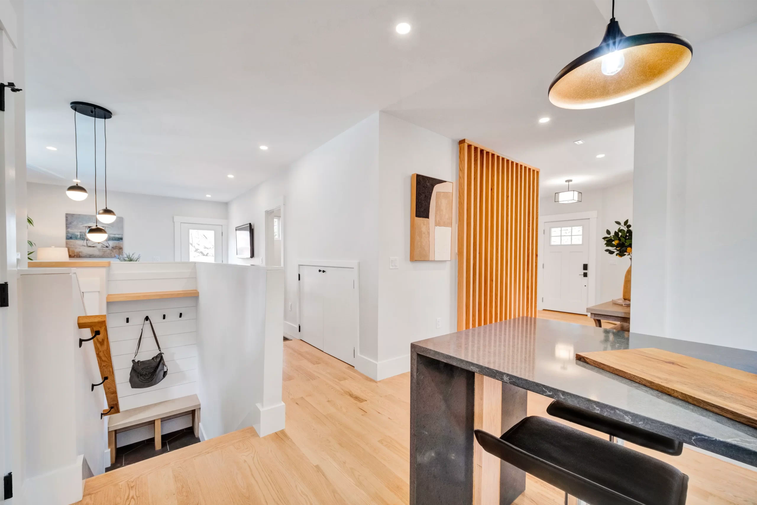 Bathed in light from top to bottom, this striking new home construction is a masterclass in vertical illumination and thoughtful design. Natural light cascades through the stairwell, flowing down from skylights and sizable windows to brighten each level with a warm, airy glow. The first floor offers a distinctly social layout, where an open-concept living and dining area invites effortless entertaining. Just beyond, a cozy, modern kitchen anchors a more intimate space—complete with a family room, bedroom, and full bath—creating a seamless blend of public and private living. This home contains six bedrooms and four full bathrooms, built into a spacious and cohesive layout, each bedroom offers effortless comfort and privacy. Sliding doors offer easy access to the backyard, extending the home’s livability outdoors. At night, a sculptural chandelier suspended in the stairwell casts a soft, ambient light, transforming the vertical core of the home into a glowing architectural centerpiece.