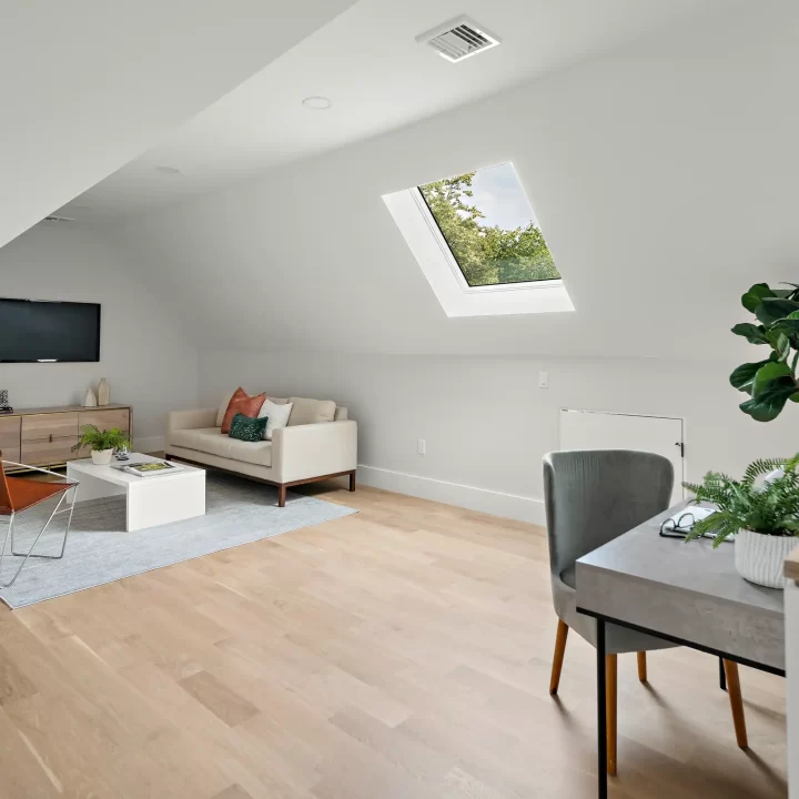 Incorporating overhead natural light into your remodeled attic can effortlessly transform it from a dark, unused area into a warm and inviting occupiable space. To enhance the natural light, light colored walls are included to amplify the sense of spaciousness and add an airy, fresh tone to your new, finished attic.