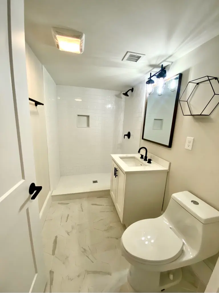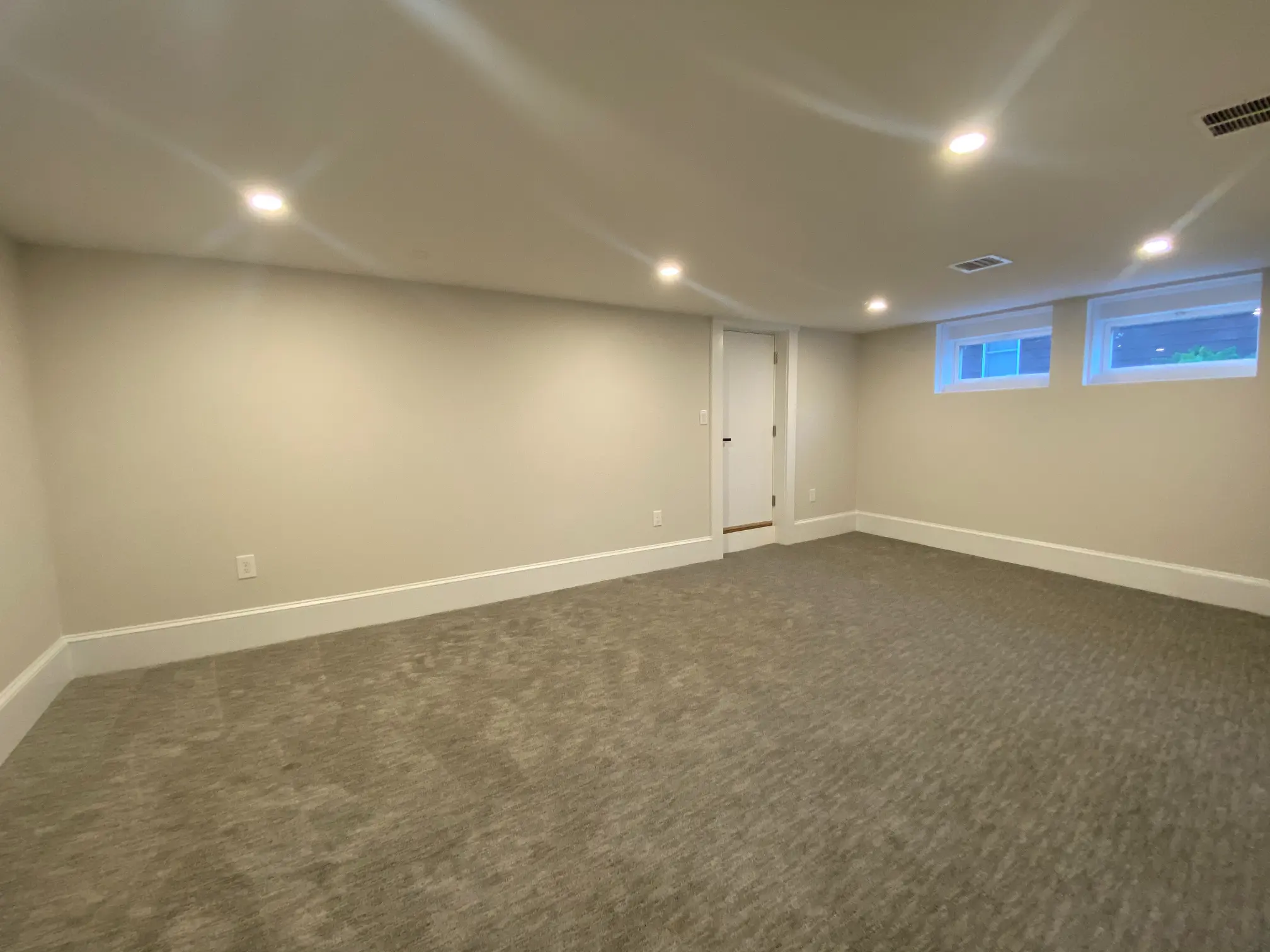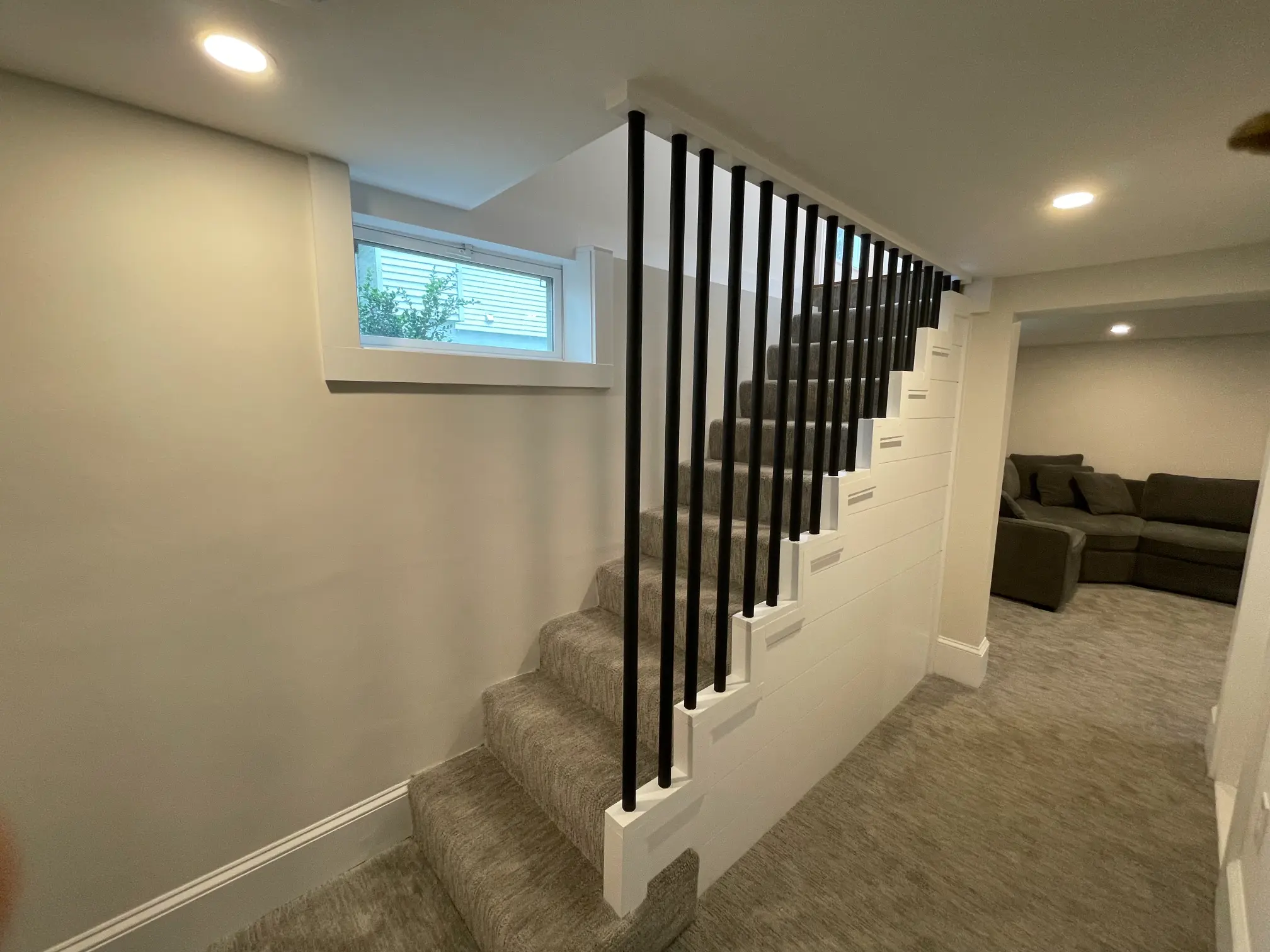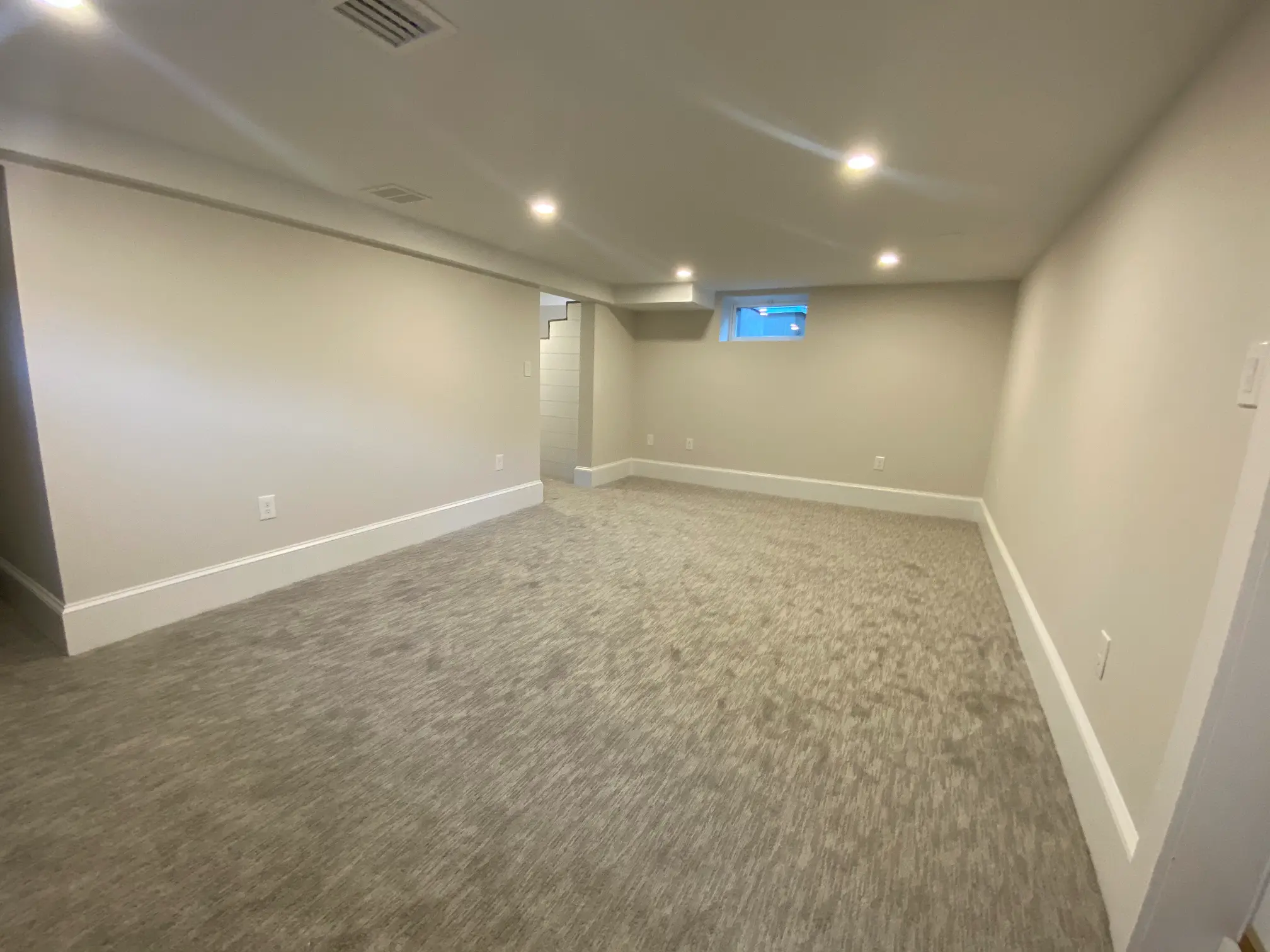 Step into this stunningly renovated basement, where modern design meets cozy functionality. The transformation begins with a sleek new staircase that effortlessly guides you into the heart of the space, setting the tone with clean lines and contemporary finishes. The living room invites relaxation with its soft, neutral palette, layered textures, and thoughtfully placed lighting that creates an inviting ambiance. Just beyond, the brand-new bathroom is a true showstopper—boasting minimalist fixtures, a spacious shower, and matte black accents that add just the right touch of sophistication. Whether hosting guests or enjoying a quiet evening in, this basement redefines lower-level living with elevated style and comfort.